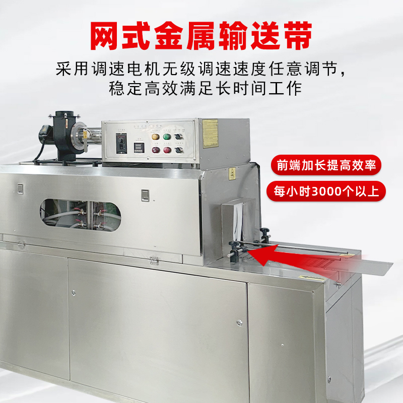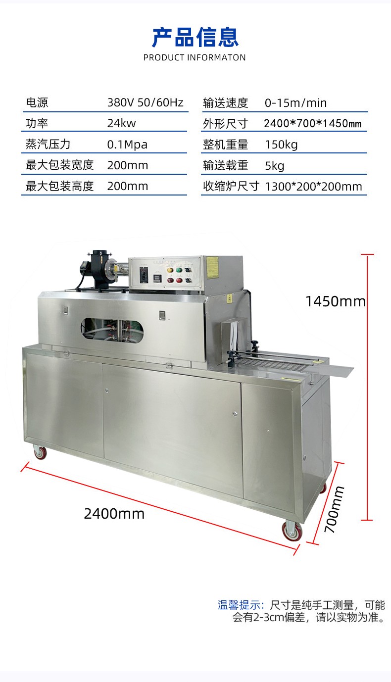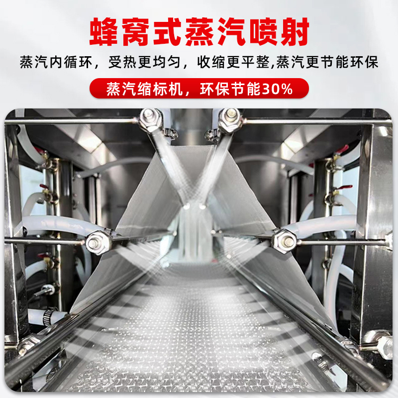 配備 PLC 智能控制系統,可精準調節蒸汽溫度(50℃-120℃可調)、輸送速度與蒸汽噴射量,兼容 POF、PVC、PE 等多種熱收縮膜材,滿足不同產品的包裝厚度與質感要求。