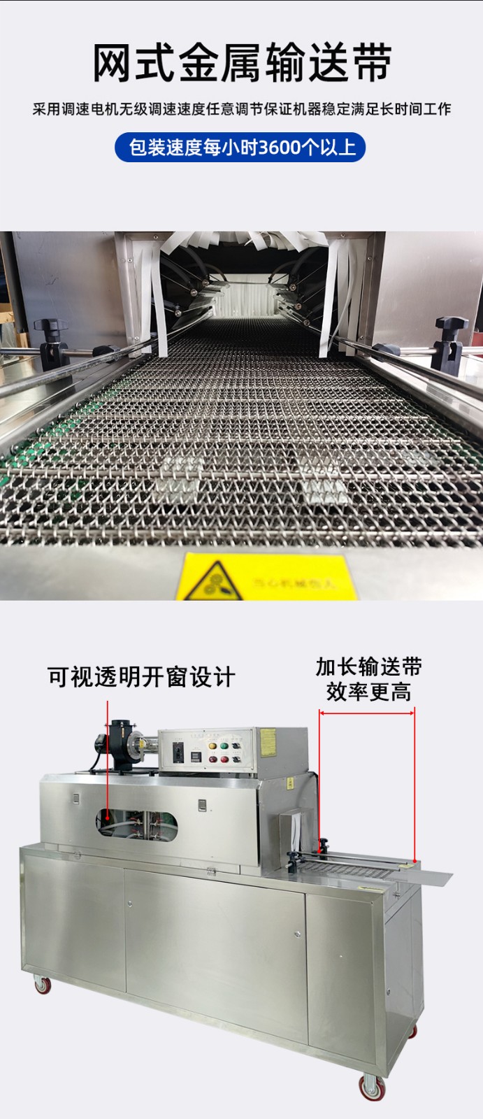 收縮室采用環形蒸汽噴射設計,蒸汽能 360° 無死角包裹產品表面,使熱收縮膜受熱均勻,收縮后緊密貼合產品輪廓,無褶皺、無氣泡,即使是異形、棱角分明的產品(如五金工具、瓶裝飲料),也能實現平整光滑的包裝效果。